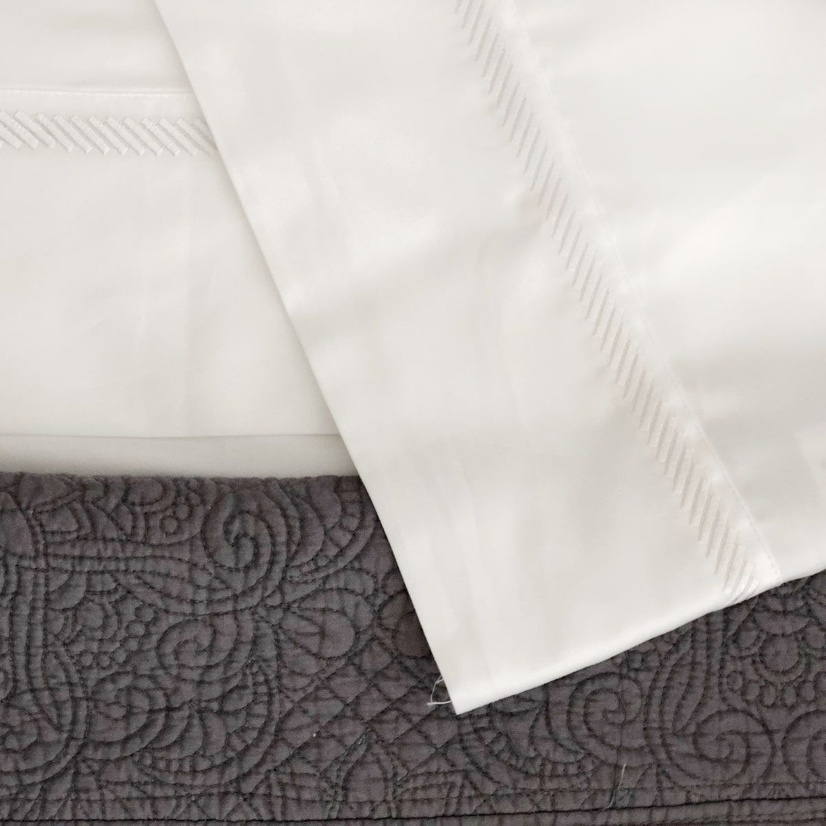 Su diseño incluye un festón bordado en diagonal, sutil y elegante, que aporta un detalle decorativo único y delicado.