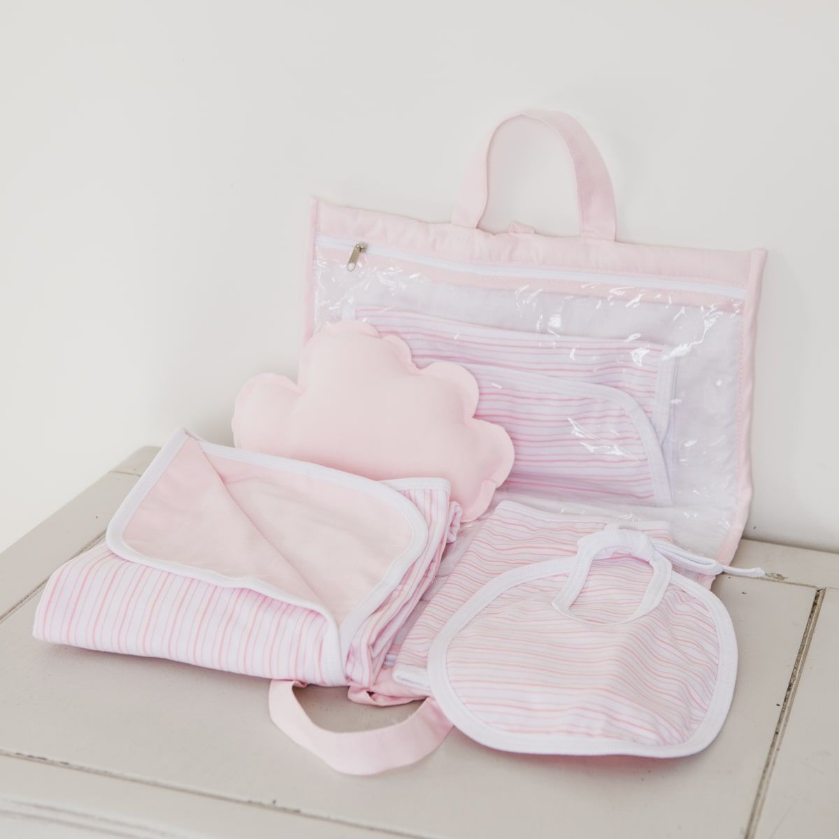 Set de nacimiento para recibir a tu bebe. Viene con 5 piezas: una manta 100% algodón reversible de 0,70 x 0,85, 2 babitas, 1 babero y un almohadón de apego. El diseño puede variar ligeramente según la disponibilidad.