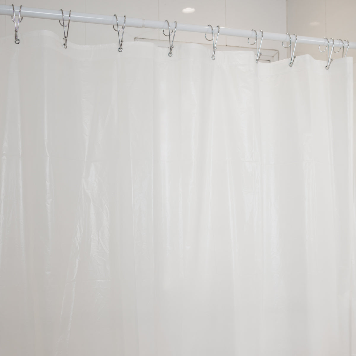 Cortina protectora de baño confeccionada en PVC blanco, diseñada para evitar que el agua traspase hacia fuera de la ducha y proteger cortinas textiles. Incorpora pesas imantadas en la parte inferior, que aseguran una caída firme y evitan que la cortina se mueva con el vapor o el viento.