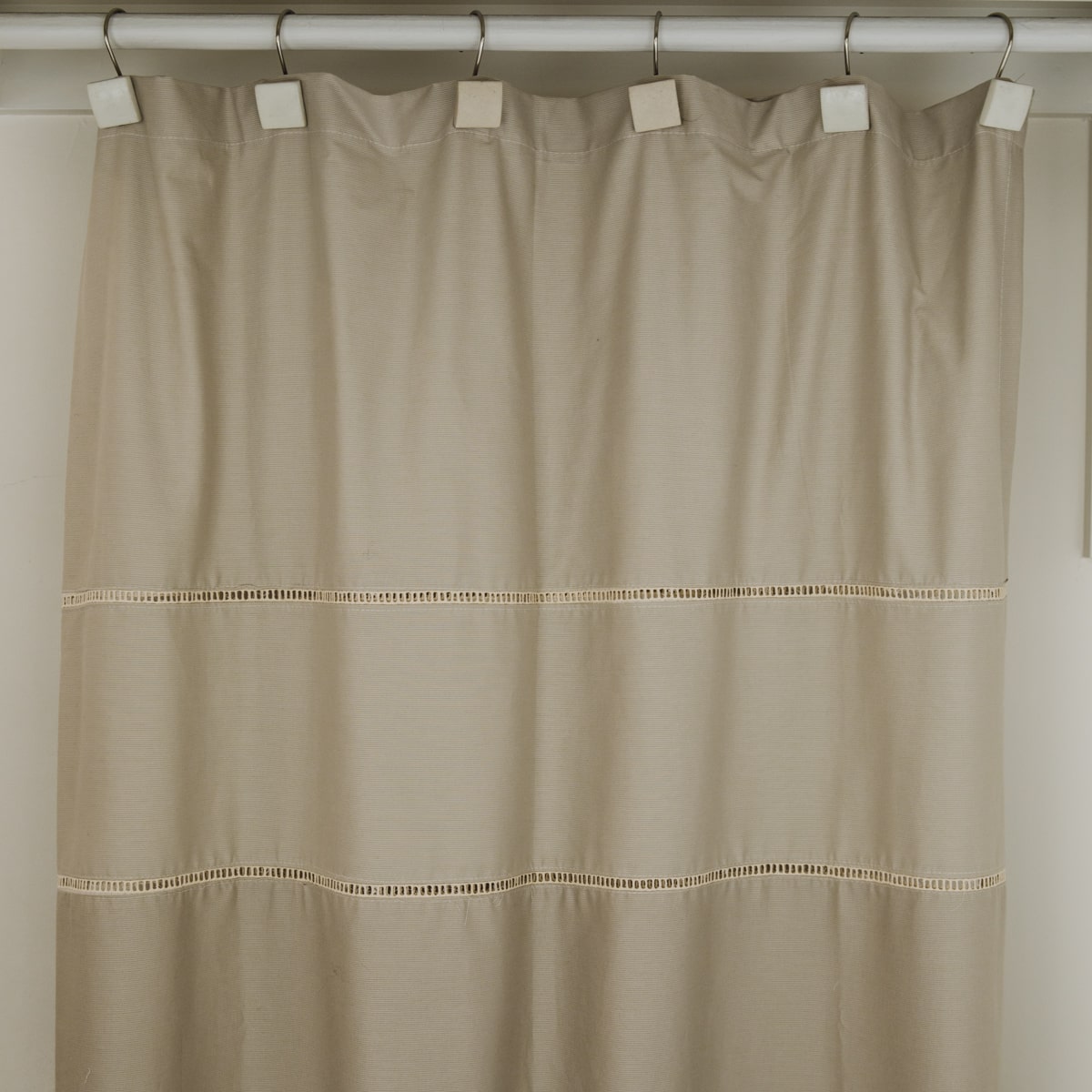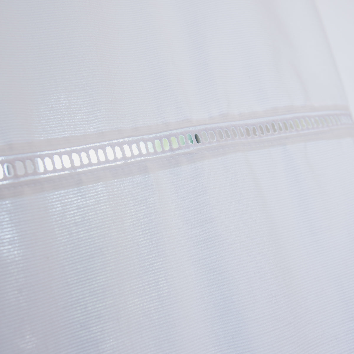 Confeccionada en piqué 100% algodón, esta cortina presenta un diseño sobrio en tono blanco o crudo, realzado por un borde con calado horizontal tipo vainilla, que le aporta textura y un toque distintivo sin perder su simpleza.