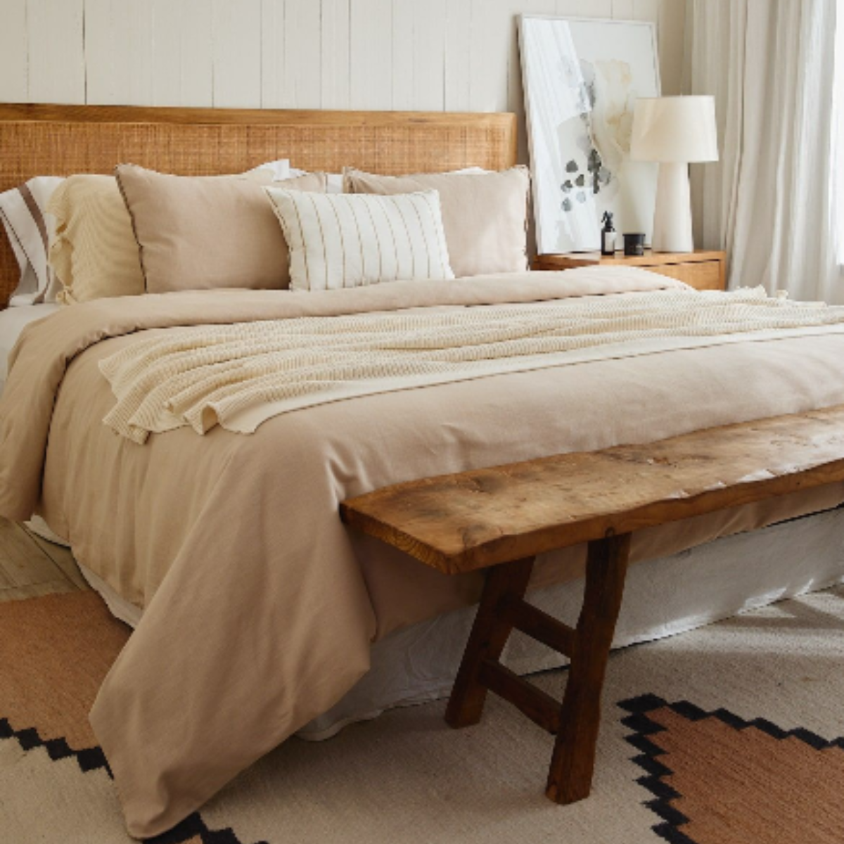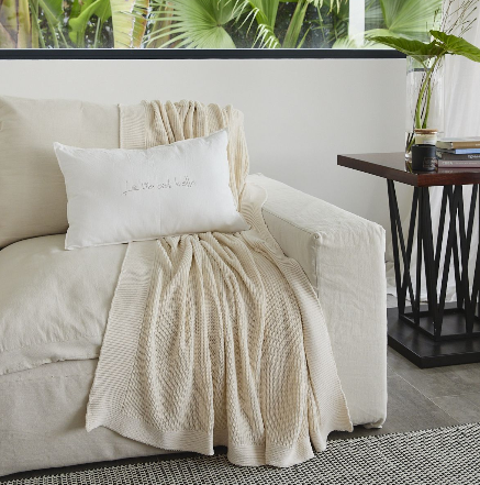 Manta tejida en 100% algodón, suave al tacto y con un acabado natural que aporta calidez y estilo a tus espacios. Ideal para usar como pie de cama o como complemento decorativo en el living.
